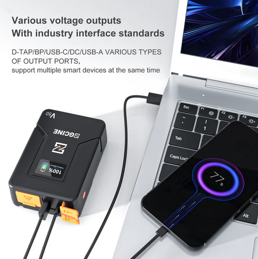 Podpira vhod USB-C s hitrostjo polnjenja 20 V/2 A (MAX) in ponuja več izhodnih možnosti, vključno z USB-C, D-Tap in DC. Izhod USB-C zagotavlja vsestranske možnosti napajanja od 5 V do 20 V, izhod D-Tap pa lahko zagotavlja do 14,8 V/9,6 A, zato je ta baterija primerna za številne naprave, od fotoaparatov do visokozmogljivih luči LED.