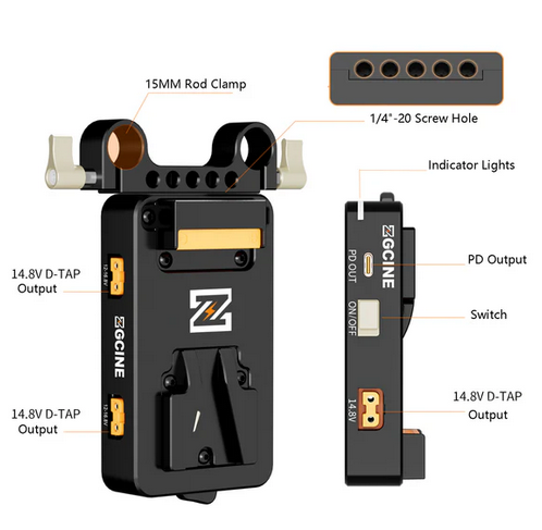 ZGCINE VM-VP3 je kompaktna plošča z V-nosilcem, zasnovana za napajanje kamere in dodatkov iz ene same baterije z V-nosilcem. Ima več reguliranih izhodnih vrat, vključno z USB-C PD in tremi D-Tap vrati, skupaj z BPU vratom za združljive kamere. S preprostim upravljanjem napajanja z enim gumbom je ta plošča vsestranski in zanesljiv napajalni vozlišče.