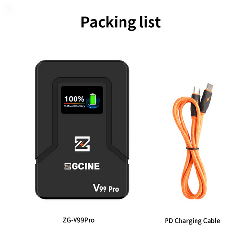 Baterija ZGCINE ZG-V99Pro V-Mount je nadgrajena različica baterije V99 s hitrim polnjenjem PD 100 W, več izhodnimi priključki in pametnim zaslonom v realnem času, zato je zmogljiva in vsestranska energetska rešitev za filmske ustvarjalce in fotografe.