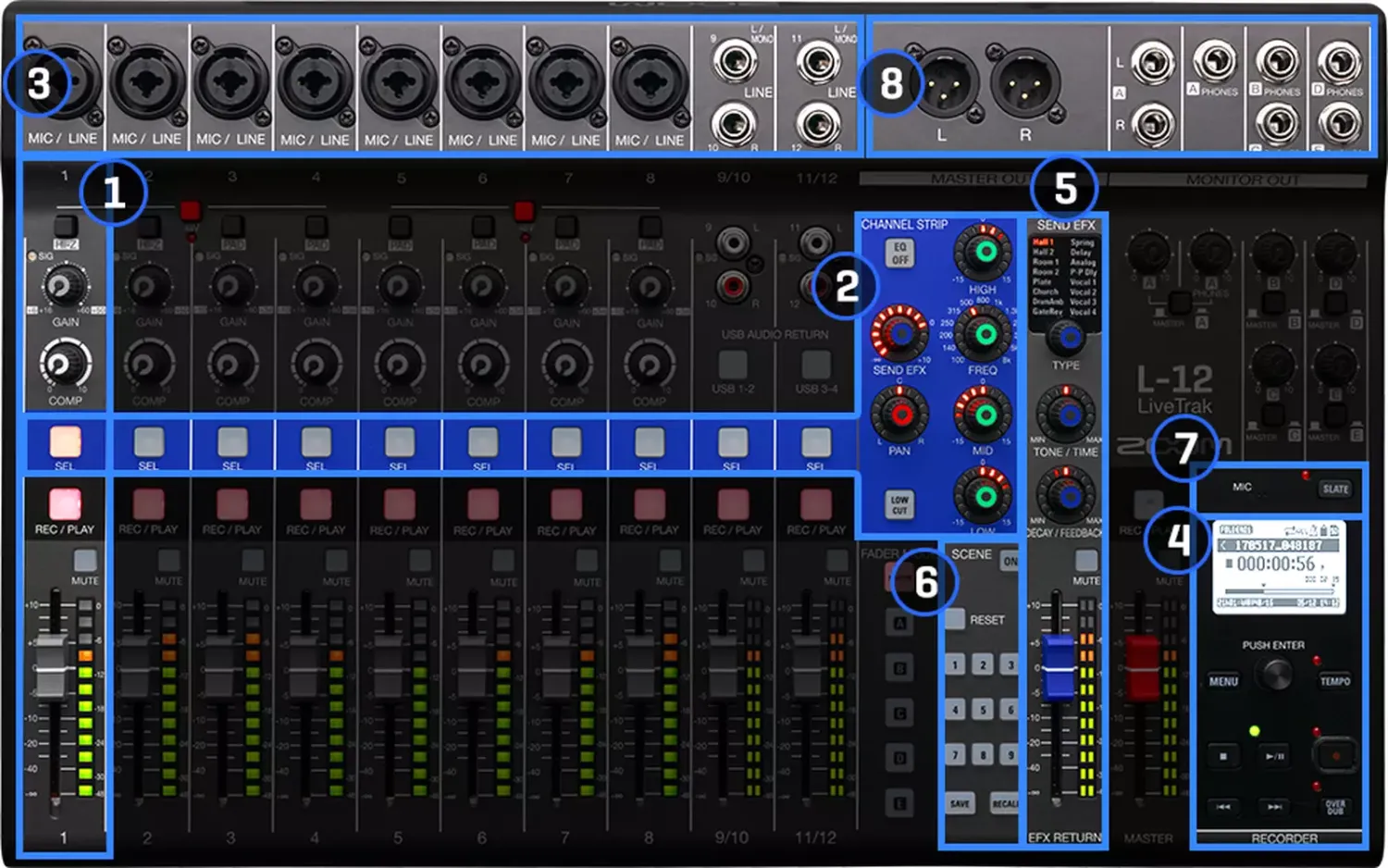 LiveTrak L-12 je edina digitalna konzola, ki omogoča mešanje zvoka v živo, hkratno snemanje do dvanajstih skladb in vmes celo ustvarjanje petih neodvisnih, prosto nastavljivih mešanic za slušalke. Končno lahko mešate, snemate in spremljate z eno samo napravo.